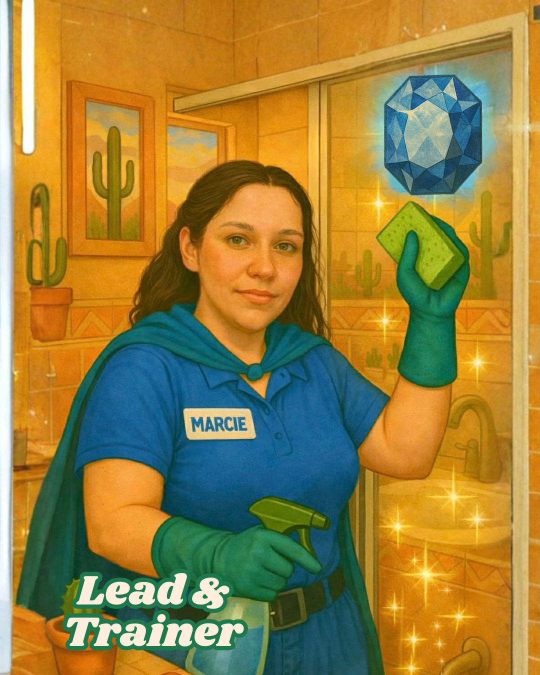 She holds a deep appreciation for the arts—her favorite animation series is the original Cowboy Bebop. She is a proud University of Arizona graduate. Her cleanings are energized by the rhythm of reggaeton and Bad Bunny, with podcasts serving as a welcome switch when variety calls. A detail-oriented cleaner, Marcie never overlooks the sink and its details, paying special attention to buildup around the drain with her grout scrubber.
